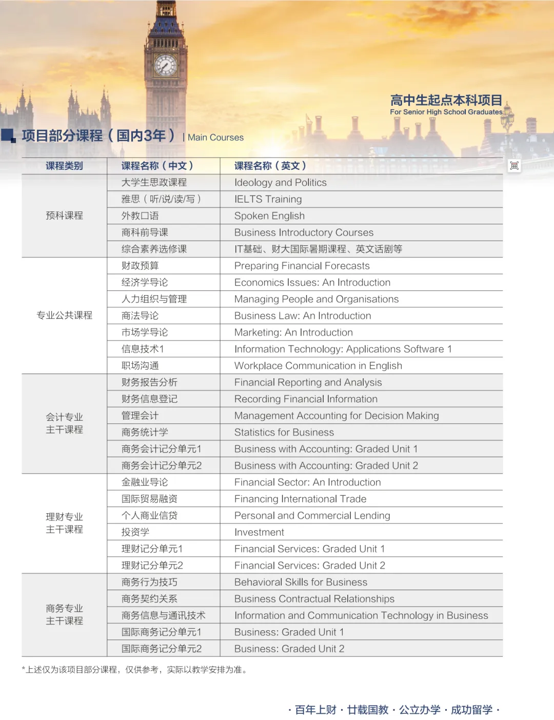 3年 | 第1年学习语言强化、商科专业前导课程和思政课程;第2-3年学习项目专业课程和思政课程。完成国内3年的学习后,办理签证自费出国留学。