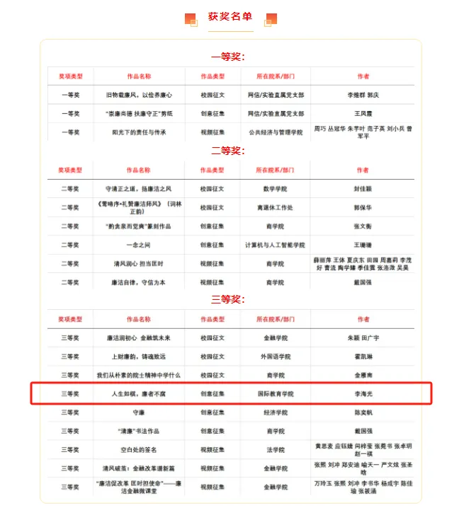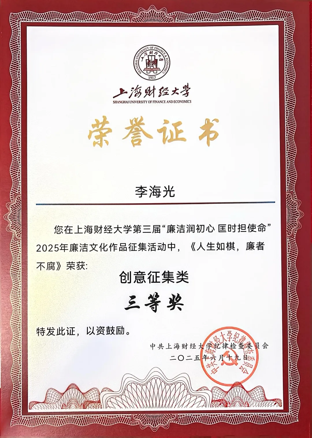在上海财经大学第三届“廉洁润初心 匡时担使命”2025年廉洁文化作品征集活动中,国际教育学院直属党支部积极参与,提交的作品《人生如棋,廉者不腐》荣获创意征集类三等奖。