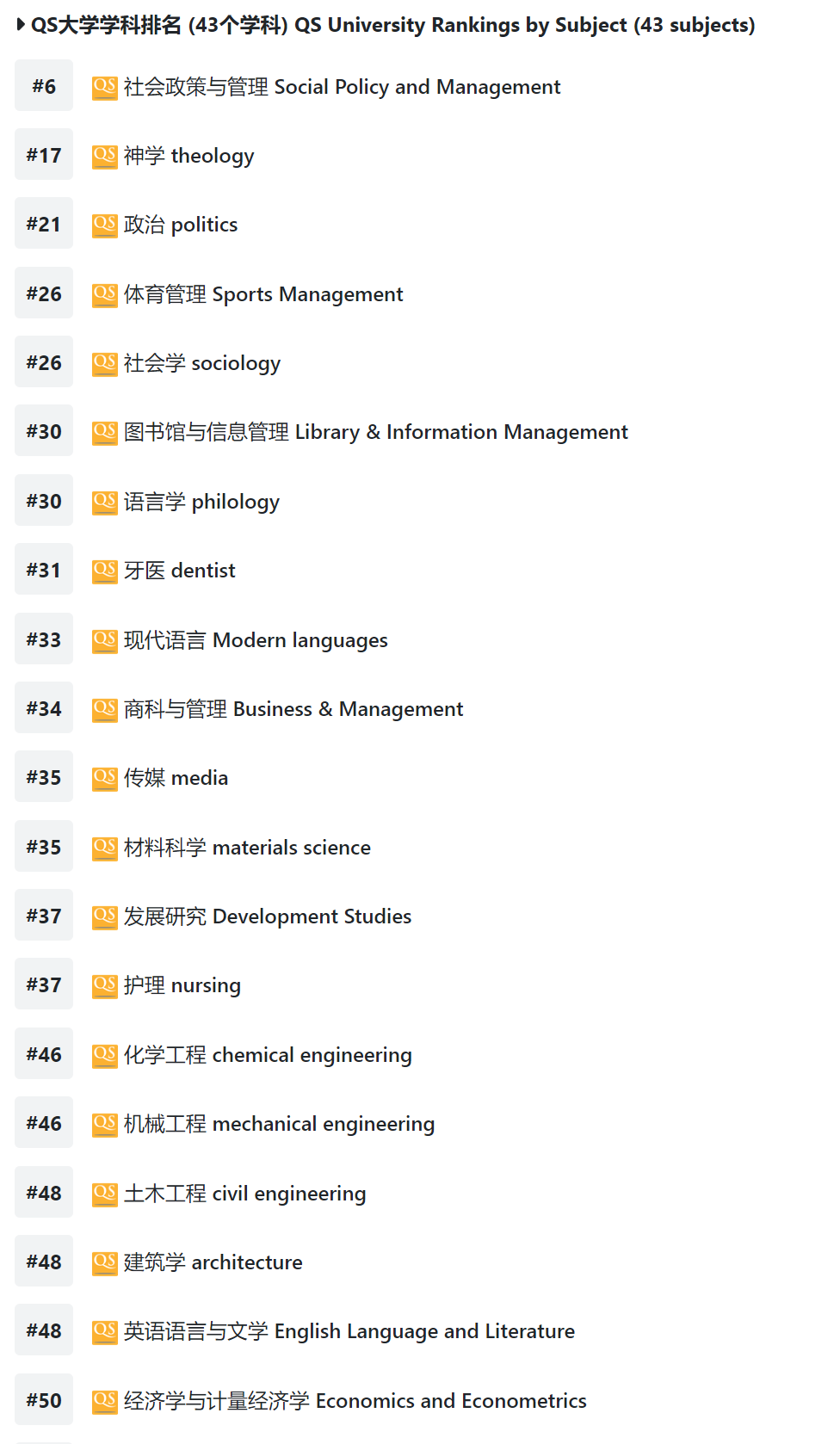 2025年QS世界大学学科排名,延世大学有20个学科位列世界前50行列!具体学科排名如下: