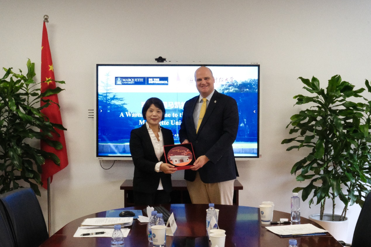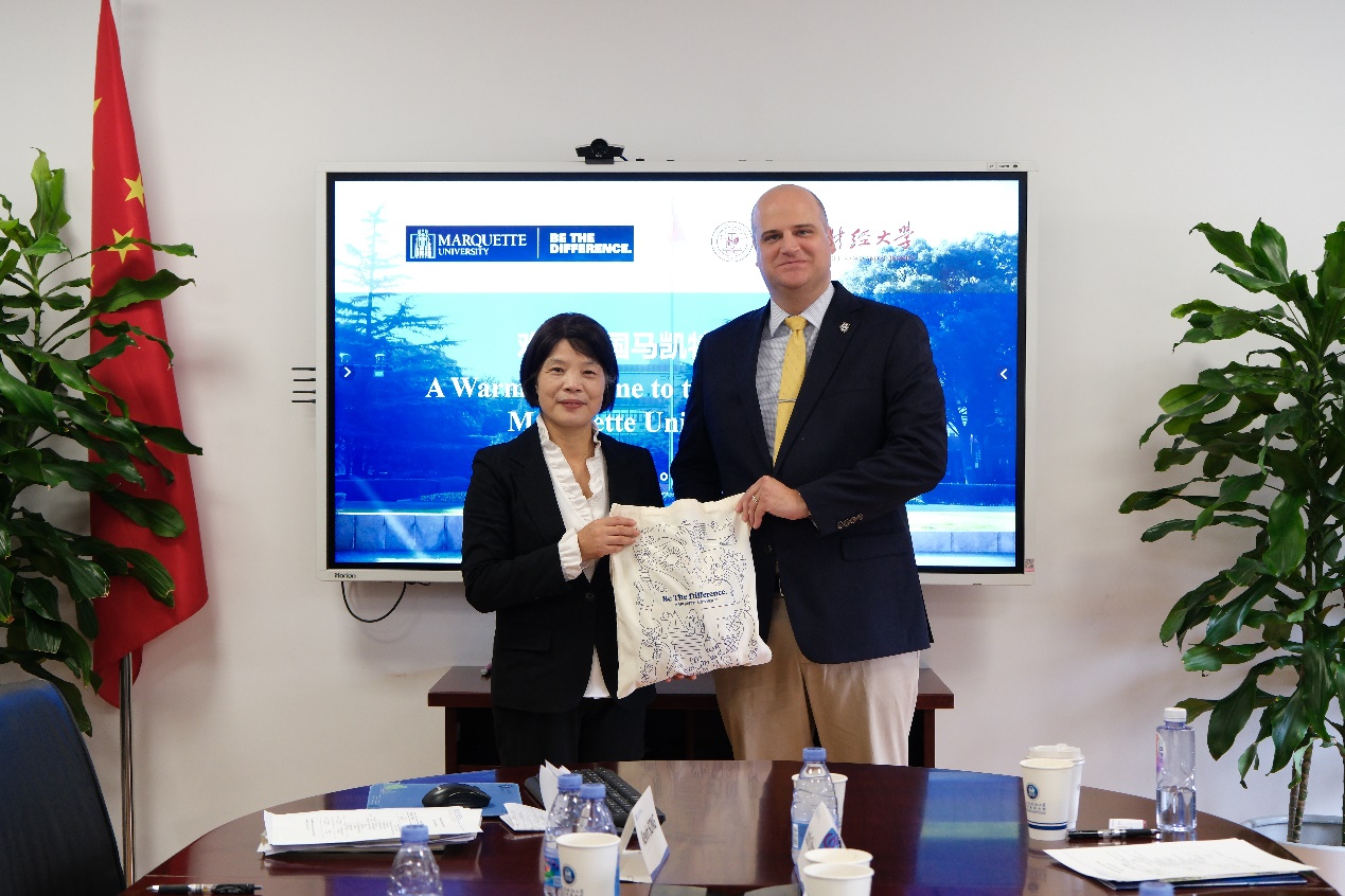 在交流座谈环节,双方代表围绕学生互访、学分互认、夏令营项目等学生交流事宜深入探讨,并就教师沟通交流、联合科研及马凯特大学参与上财暑期课程等合作方向进行了热烈的交流和讨论。会谈最后,姚玲珍副校长与Brain Troyer副校长互换了两校各具学校办学特色的纪念物品。