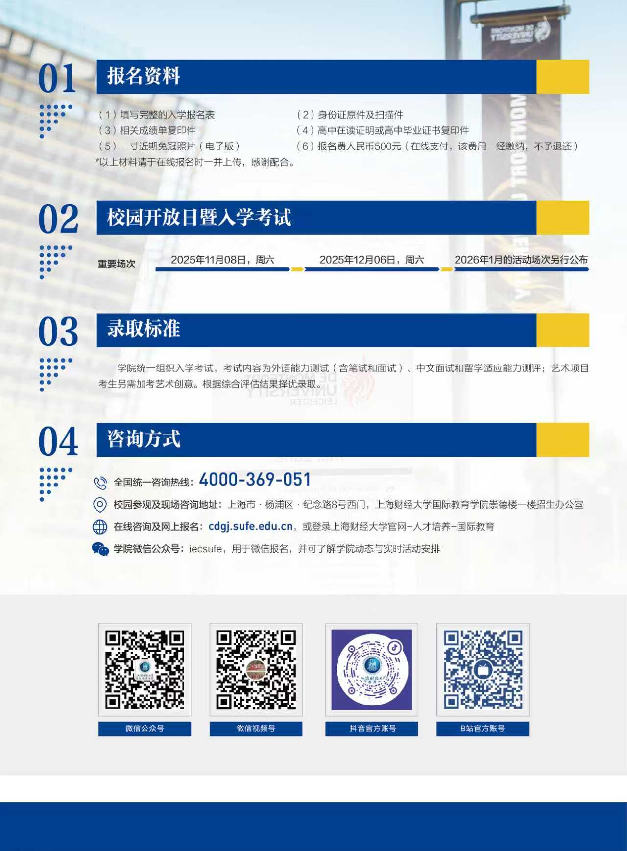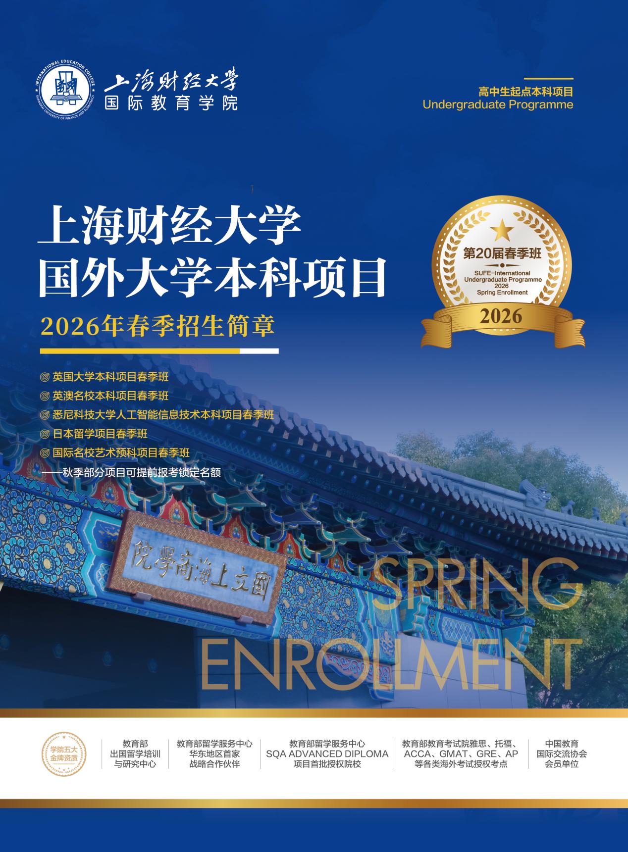 上海财经大学国际教育学院成立于2004年,是上海财经大学的直属学院,也是全国首批、沪上首家专门从事出国留学项目教育培养的公办学院。上海财经大学计划外的出国留学项目统一归口于国际教育学院进行招生和教学培养。二十余年来,学院的权威资质、办学声誉、教学质量、严谨学风、专业服务得到了国际合作伙伴以及社会各界的认可与好评。迄今为止,学院已累计培养逾9500名学生,常年保持高出国率。学院学生的整体素质获得国外合作院校的赞许,有83%左右的学生在获得国外大学学士学位后选择进一步深造;学生所获的学士学位、硕士学位或博十学位均可获得中国教育部认可,并在申请后可获得教育部留学服务中心出具的国(境)外学历学位认证书。