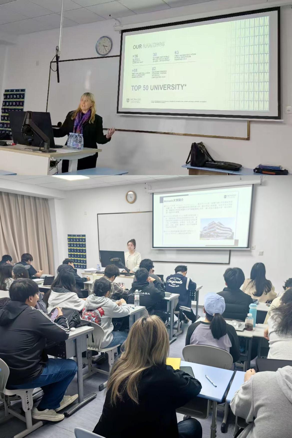 会谈结束后,代表团一行与项目内部分学生亲切见面,Carla Wilkin教授与Emma老师共同为同学们带去蒙纳士大学的问候,并详细介绍了项目的上升路径以及抵达澳洲后的细致规划。面对心仪目标院校的到来,同学们踊跃提问,从课程衔接、奖学金申请到墨尔本生活攻略,分享与互动接连不断,现场气氛活跃。
