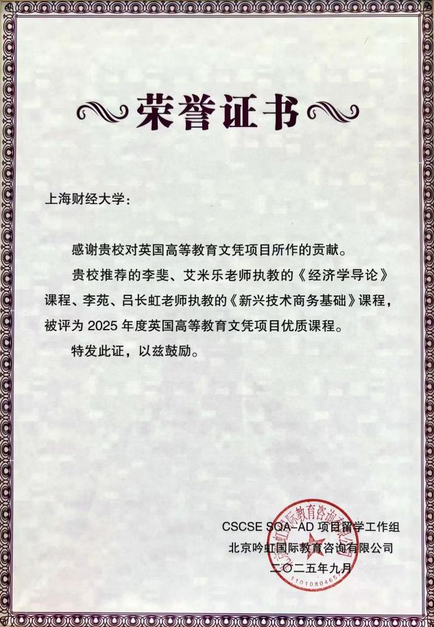 近日,2025年英国高等教育文凭项目“优质课程”全国评选结果正式揭晓。我院在此次评选中再创佳绩,两门联合执教课程凭借卓越的教学质量与创新设计斩获重要荣誉:其中,由李斐老师与艾米乐博士联合执教的《经济学导论》课程,荣获特别奖,受举办方邀请录制课堂教学视频作为CSCSE-SQA项目观摩示范课;由李苑老师与吕长虹博士联合执教的《新兴技术商务基础》课程,获评全国优质课程。 这一优异的成绩,不仅直观印证了我院教师团队在跨学科协作、国际化教学领域的过硬专业实力与创新能力,更彰显了学院长期以来在国际化人才培养体系构建、优质课程资源打磨上的持续深耕与卓越成效,为后续课程建设与人才培养工作树立了标杆。