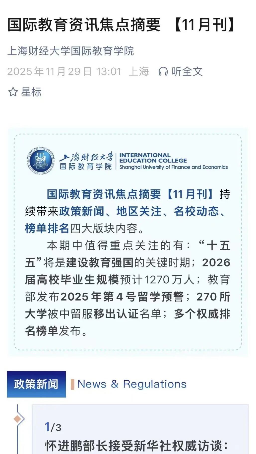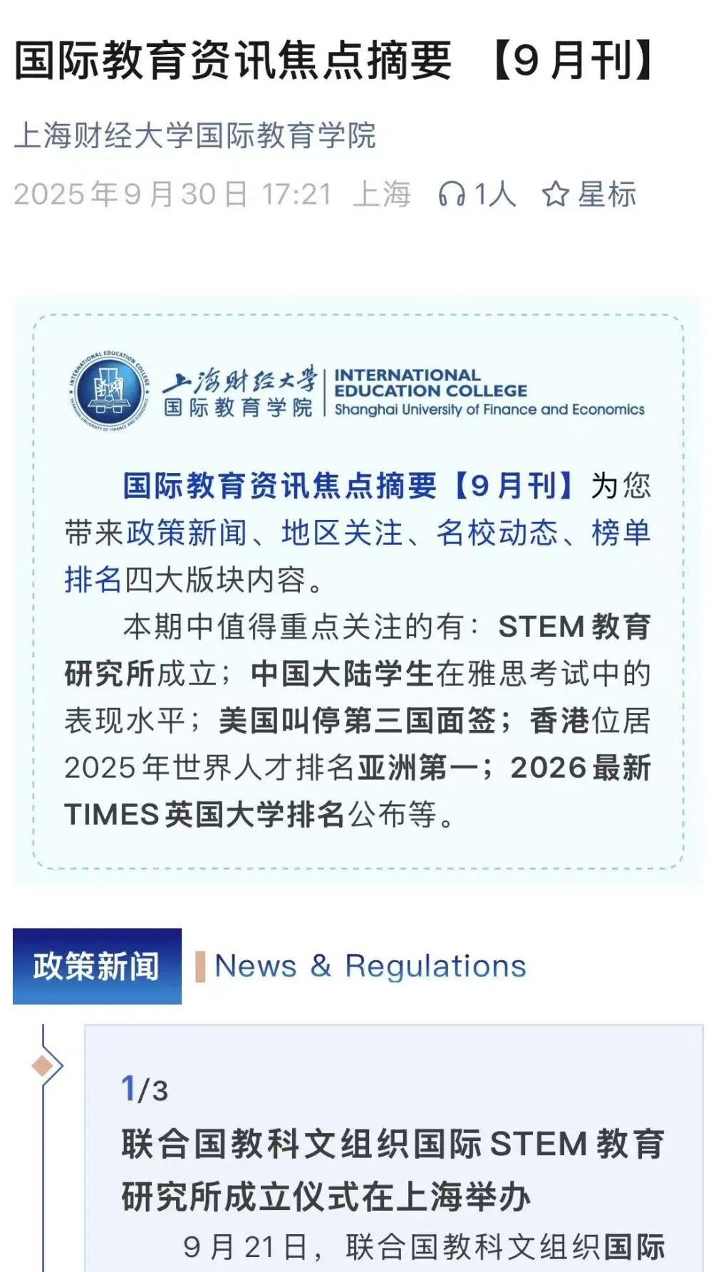 “国际教育资讯焦点摘要”以月度招生工作盘点为载体,系统梳理全球国际教育领域的重要政策、地区动态、名校信息与权威榜单,为学生与家长提供清晰、可靠的资讯参考。栏目通过重点提炼与结构化呈现,帮助读者在纷繁信息中快速把握趋势与要点。在这里,资讯不止于更新,更强调理解。通过对政策走向、留学环境与高校动向的持续跟踪,栏目引导学生建立宏观视野与理性判断,使升学规划建立在充分信息与清晰认知之上。