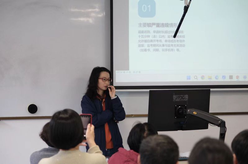 本次培训由学院课建办统一统筹、精心组织。培训对监考人员的工作流程进行了精细化梳理,构建了从考前、考中到考后的闭环管理机制。培训现场,课建办相关负责人结合学院考试工作实际,系统讲解了监考工作的核心职责、标准化操作流程、常见问题处置及纪律要求等内容,重点强调了关键节点和注意事项,深刻阐述了监考工作对维护考试公平、营造优良学风的重要意义。