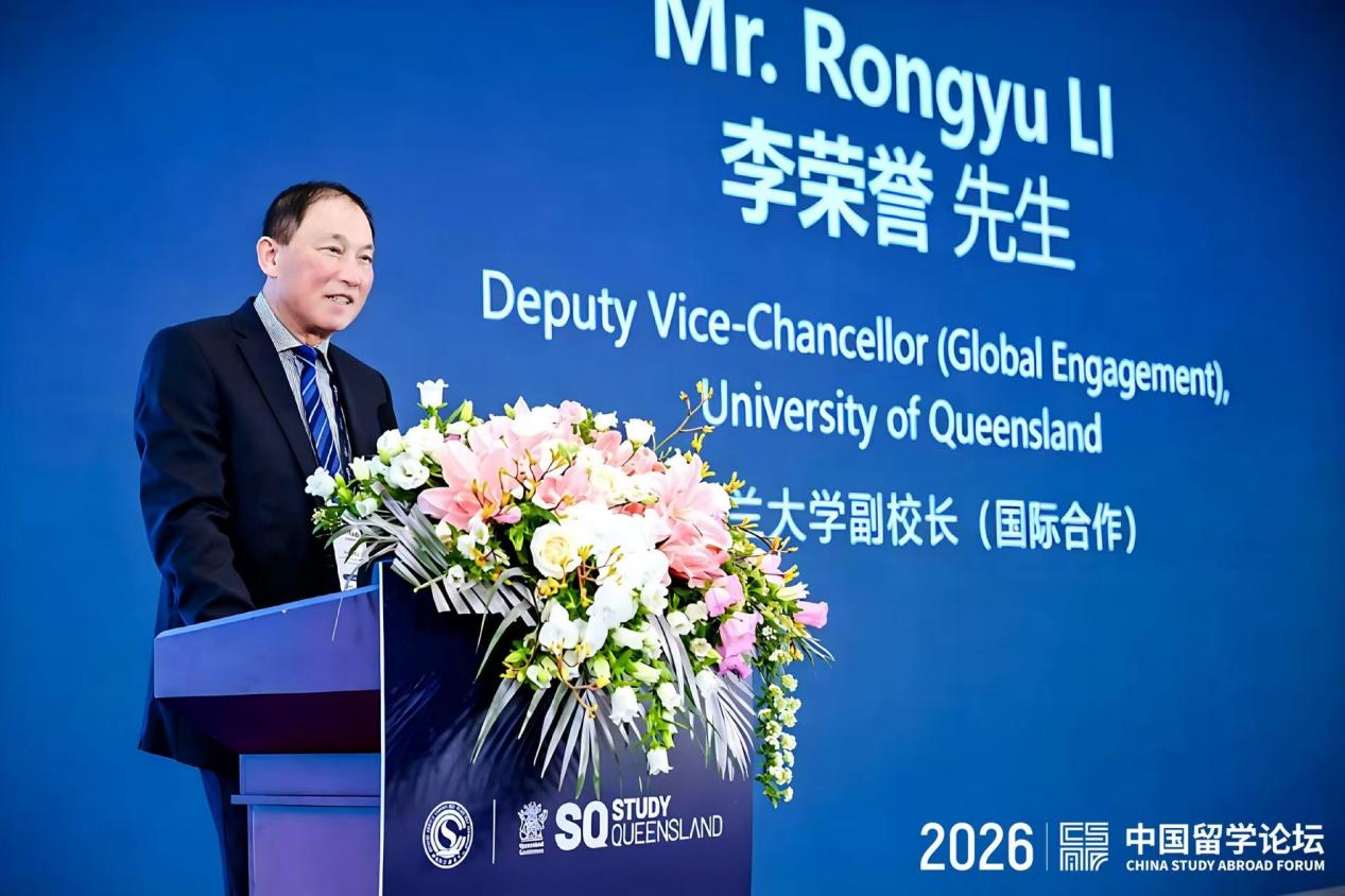 主旨发言环节,昆士兰大学副校长(国际合作)李荣誉(Rongyu Li)围绕“未来型全球领导者培养”作主旨分享。他指出,人工智能、数字化、自动化等新技术正深刻改变劳动市场与产业结构,高等教育已不能停留于单一知识传授,而应更加注重学生就业能力、创新意识、跨领域融通能力和跨文化胜任力的培育。跨文化学习不是国际教育中的附加项,而是未来领导者必须具备的核心能力。