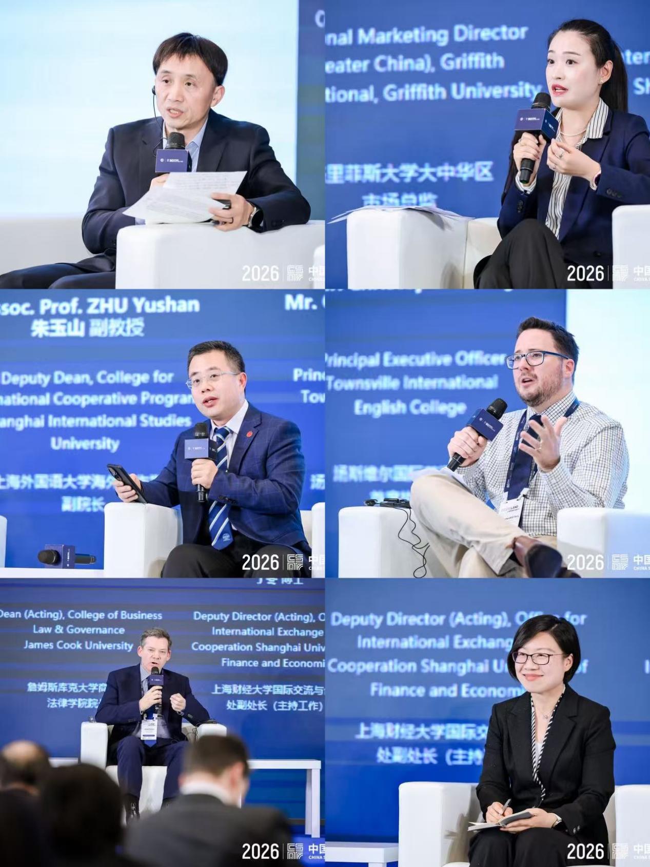 专题讨论环节由上海财经大学国际教育学院副院长李劲松教授主持。詹姆斯库克大学商科与法律学院代理院长Jamie Fellows博士、上海财经大学国际交流与合作处副处长(主持工作)丁冬博士、格里菲斯大学大中华区市场总监Jennifer Zhang女士、上海外国语大学海外合作学院副院长朱玉山副教授、汤斯维尔国际英语学校首席执行官Christopher Perry先生等嘉宾参加讨论。